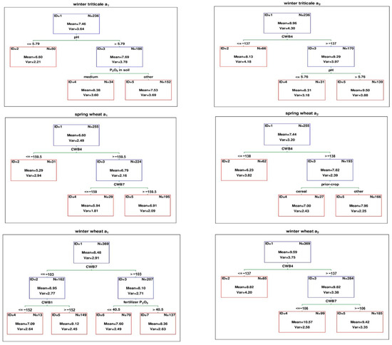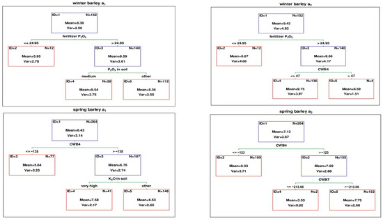 The CART analysis was conducted separately for each cereal species (winter and spring triticale, winter and spring wheat, and winter and spring barley) and for each agrotechnical input level (a1 and a2). This approach offered a more detailed understanding of how the selected variables influenced yield variation under different management intensities.