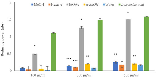 Reducing power assay of extract and solvent fractions from Paeonia japonica (Makino) Miyabe & Takeda roots. (* p < 0.05, ** p < 0.01, *** p < 0.001).
