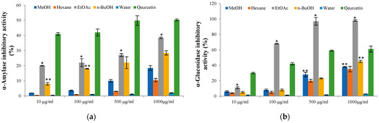 α-amylase (a) and α-glucosidase (b) inhibitory activity of extract and solvent fractions from Paeonia japonica (Makino) Miyabe & Takeda roots. * p < 0.05, ** p < 0.01; all significant differences among the groups were evaluated by Duncan’s LSR test.
