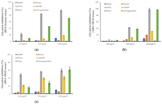 Glycation inhibitory activity analysis of the extract and solvent fractions from Paeonia japonica (Makino) Miyabe & Takeda roots in BSA–fructose (a), BSA–methylglyoxal (b), and arginine- methylglyoxal (c) models.