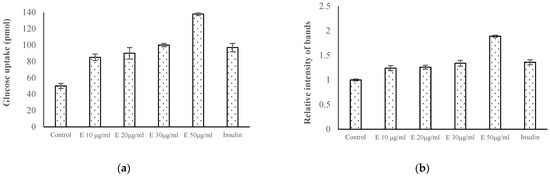 Effect of treatment with EtOAc fractions from Paeonia japonica (Makino) Miyabe & Takeda roots on glucose uptake by 3T3-L1 cells (a). Basal mRNA expression of GLUT4 in 3T3-L1 cells (b).