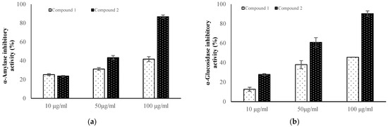 α-amylase and α-glucosidase inhibitory activities of the compound 1 (a); α-amylase and α-glucosidase inhibitory activities of the compound 2 (b). Compound 1: 4-O-methylgallic acid; Compound 2: ellagic acid.