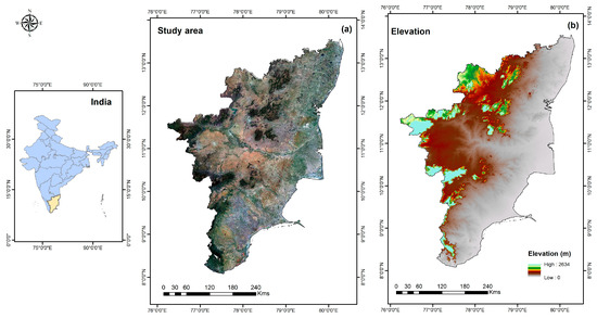 Digital soil mapping (DSM) was carried over for the entire state of Tamil Nadu (Figure 1). The state of Tamil Nadu is surrounded by four major soil types: coastal soils, laterite soils, red soils, and black soils. It is situated between latitudes 08°05′ and 13°35′ N and 76°15′ and 80°20′ E. The total geographical area is 130,058 km2. The northern parts are home to the Eastern Ghats, a chain of erratic hills, while the Western Ghats Mountain ranges border its western edge. Kerala shares a western boundary with the Western Ghats, preventing Kerala from receiving most of the southwest monsoon’s rain-bearing clouds. Arid and semi-arid conditions dominate the south–central and central regions.