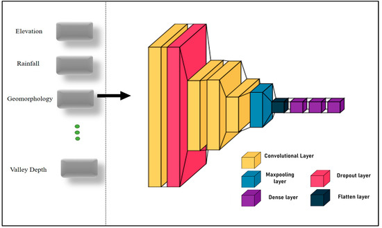 Similar to the DL-MLP, the 1D-CNN model involved moderate complexity and decreasing kernels and kernel sizes. Such model definition might help to reduce the need for high computational resources and the risk of learning noisy, irregular features/patterns in the data. The model included one dropout rate of 0.5 to avoid overfitting, and a flattened layer connecting the convolutional and max-pooling layers with the dense layers. The max-pooling was used in the model to facilitate the down-sampling (optimizing/noiseless) of the observations and to retain only the most relevant observations, decided based on the patterns recognized concerning the input covariate layers. The 1D-CNN model was fitted with the Adam optimizer [28] and the learning rate and epochs of 0.001 and 100, respectively. The model fitting was performed with the validation loss metric of categorical cross-entropy and the validation metric of accuracy. The architecture of the one-dimensional CNN, including the order of hidden layers, dropout, and flattened layers, is represented in Table 2.