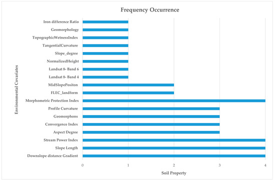 The RFE resulted with the physiography, rainfall, mean temperature, elevation, LULC, and carbonate difference ratio as some of the most influential factors in predicting the continuous and categorical soil attributes. Based on the rankings for each soil attribute, the covariate layers with the lowest ranks were eliminated based on the covariate occurrence frequency. The covariate occurrence frequency plot includes the occurrence of covariates in the lowest rankings of all four soil properties subjected to RFE, which were subjected to elimination. From Figure 4, it could be stated that the downslope distance gradient, slope length, stream power index, and morphometrics position index occurred in the lowest ten ranks of all the soil properties to be predicted. Similarly, all the other soil properties can be interpreted from the figure. The covariate occurrence frequency for the covariates in the lowest ten ranks for all of the soil properties is plotted and depicted in Figure 4.