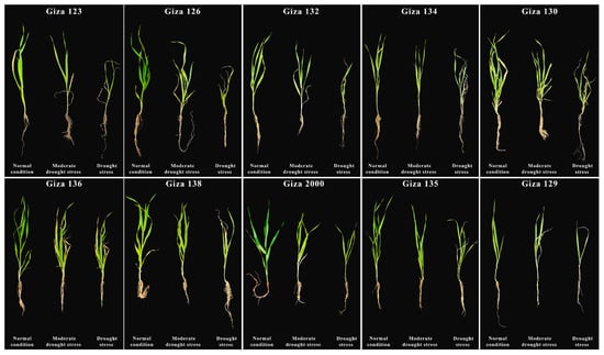 Comparative analysis of ten cultivars under varying drought conditions. The figure illustrates the impact of normal conditions, moderate drought stress, and severe drought stress on the growth and root development of different Giza cultivars, highlighting the varying levels of drought tolerance across cultivars.