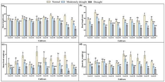 Performance and drought tolerance of ten cultivars for shoot length (cm) (a), root length (cm) (b), fresh shoot weight (c), and shoot dry weight (d). Different letters indicated significant variations among the cultivars using LSD 0.05.