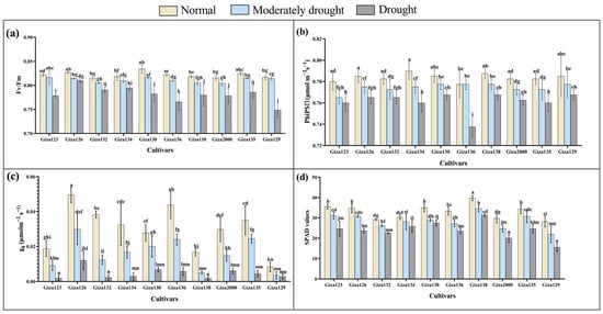 Photosynthetic efficiency, Photosystem II quantum efficiency, stomatal conductance, and SPAD values of ten Giza cultivars under normal, moderate, and severe drought conditions. (a,b) show the photosynthetic efficiency and Photosystem II quantum efficiency percentages; (c) the stomatal conductance under drought stress (gsw) values; (d) SPAD values under different drought stress. Different letters indicated significant variations among the cultivars using LSD 0.05.