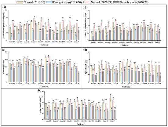 Mean performance of days to heading (a) and number of days to maturity (b), plant height (cm) (c), spike length (cm) (d), and number of kernel spikes−1 (e) for studied cultivars under normal and drought stress conditions across irrigation treatments and two seasons. Different letters indicated significant variations among the cultivars using LSD 0.05.