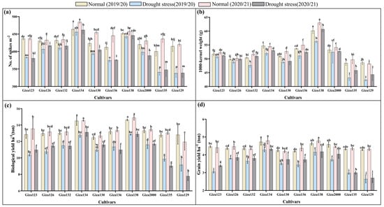 Performance of the number of kernel spikes−1 (a), 1000-kernel weight (b), biological yield ha−1 (c), and grain yield ha−1 (d) for the studied cultivars under normal and drought stress conditions in the two seasons across the irrigation treatments and the two seasons. Different letters indicated significant variations among the cultivars using LSD 0.05.