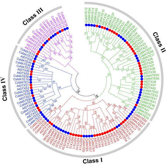 Phylogenetic relationships of MATE proteins of Arabidopsis and the tea plant. Blue dots represent MATE proteins from the tea plant and red dots represent MATE proteins from Arabidopsis. Branch colors represent different classes. The numbers assigned to branches indicate the reliability.