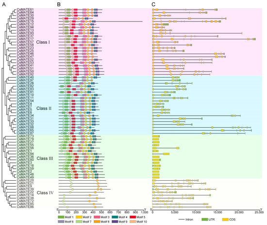 Intron–exon and motif composition of CsMATEs. (A) Phylogenetic tree of CsMATEs. (B) 10 conserved motifs in CsMATE proteins. (C) Intron–exon composition of CsMATEs.