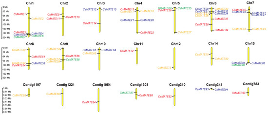 The distribution of CsMATEs on tea plant chromosomes. Font colors represent different classes. MB, megabase.