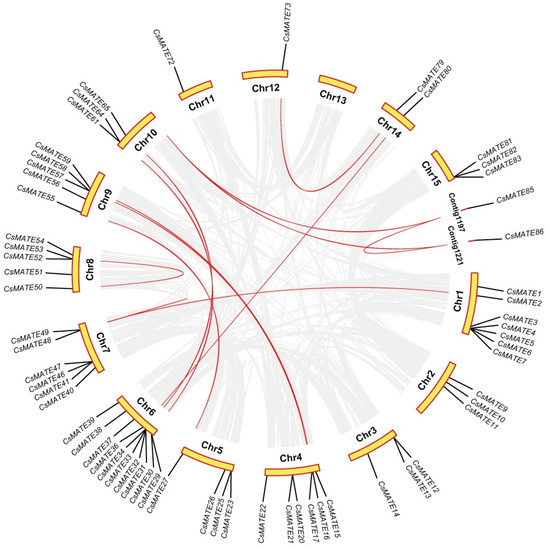 Synteny of CsMATEs in C. sinensis. Grey and red lines represent synteny blocks and CsMATE gene pairs, respectively.