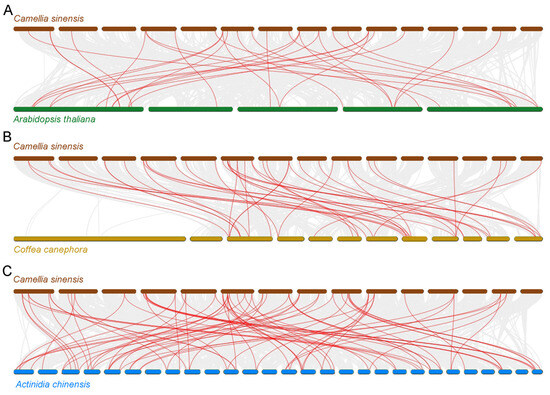 The collinearity of MATE genes in C. sinensis and three other species. (A) C. sinensis and A. thaliana; (B) C. sinensis and C. canephora; (C) C. sinensis and A. chinensis. Grey lines represent collinear blocks among C. sinensis, A. thaliana, C. canephora, and A. chinensis; red lines represent the syntenic MATE gene pairs.