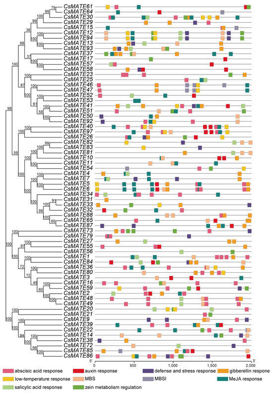 A total of 10 conserved motif were identified in CsMATE proteins by MEME (Figure S1). An extremely conserved motif (motif 8) existed in all CsMATE proteins, and a relatively conserved motif (motif 7) existed in all CsMATE proteins except CsMATE6, CsMATE29, CsMATE34, CsMATE81, and CsMATE82 (Figure 2B). The distribution of conserved domains in CsMATE proteins was divided into two categories: CsMATE proteins with only two conserved motifs and CsMATE proteins with at least eight conserved motifs. Among them, only ten CsMATE proteins contained two conserved motifs, and the entirety of these CsMATE proteins belonged to Class IV. The remaining 58 CsMATE proteins exhibited the presence of nearly all conserved motifs, with only 10 CsMATEs (CsMATE1, CsMATE11, CsMATE12, CsMATE13, CsMATE16, CsMATE53, CsMATE59, CsMATE82, CsMATE88 and CsMATE93) lacking a single motif and 9 CsMATEs (CsMATE6, CsMATE29, CsMATE34, CsMATE46, CsMATE47, CsMATE55, CsMATE58, CsMATE83, and CsMATE97) lacking two motifs.