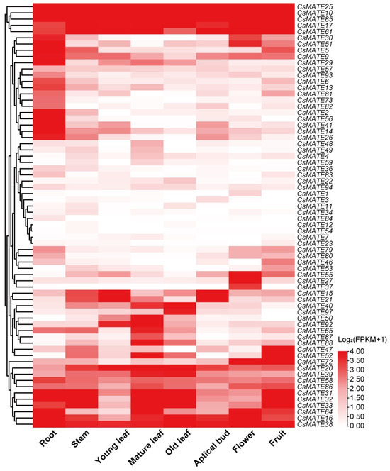 Spatiotemporal expression pattern of CsMATE genes. The heatmap of CsMATEs expression with log2 (FPKM + 1).