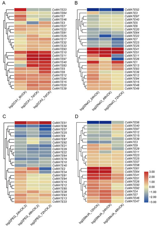 As previously mentioned, the promoters of CsMATE genes were found to contain numerous cis-acting elements related to abiotic stress and hormonal responses. Therefore, the expression profile of CsMATE genes following various abiotic stresses and hormone treatments were investigated. As shown in Figure 8, the transcription of some CsMATE genes were modulated by abiotic stress treatment. For example, CsMATE5, CsMATE6, CsMATE7, CsMATE10, CsMATE11, CsMATE23, CsMATE40, CsMATE83, and CsMATE97 were significantly induced by cold acclimation (log2Foldchange > 2). Moreover, NaCl treatment resulted in the significant induction of CsMATE1, CsMATE11, CsMATE41, and CsMATE51, with CsMATE41 and CsMATE51 exhibiting an over 20-fold increase in expression levels. Under PEG stress conditions, CsMATEs were not significantly induced, except for CsMATE2, which exhibited slight induction after 48 h of PEG treatment, and CsMATE51, which showed continuous strong induction under PEG treatment. Interestingly, the expression level of CsMATE genes also underwent significant changes following MeJA treatment. Among them, six CsMATE genes (CsMATE4, CsMATE7, CsMATE41, CsMATE51, CsMATE61, and CsMATE64) were significantly up-regulated by MeJA treatment. Thereinto, it was observed that CsMATE51 was significantly induced by NaCl, PEG, and MeJA treatments, suggesting its potential involvement in different stress responses. Overall, these findings suggest that different MATE gene members in the tea plant possess diverse functions under numerous treatments.