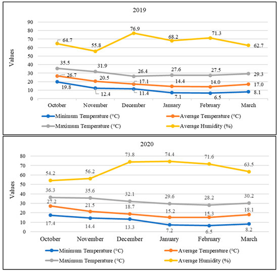 Temperature and humidity were recorded during the research period using the HOBO digital data logger. The temperature and humidity values are shown in Figure 1.