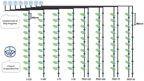 A drip irrigation system was used, and the amount of irrigation water was calculated according to evaporation in the Class-A Evaporation Pan. Since evaporation and evapotranspiration are different, the amount of evaporation measured was reduced by keeping the crop coefficient (kc) low. Different irrigation levels were considered for conventional deficit irrigation (I-125, I-100, I-75, I-50) and partial root drying (PRD-125, PRD-100, PRD-75, PRD-50) (Table 2). In the conventional deficit irrigation treatments, laterals with drippers spaced 40 cm apart were placed in each row. In the PRD treatments, two laterals were placed in each row, with a dripper spacing of 80 cm between them. The cabbage seedlings were planted at a distance of 40 cm between the drippers on the row (Figure 2). The plots were 1.28 m2 in area and contained 10 plants each. Eight plants were included in the analysis, with the first and last plants in each row considered as side effects. The research was conducted over a 2-year period, during the autumn seasons of 2019 and 2020, with three replications according to the random plots experimental design.