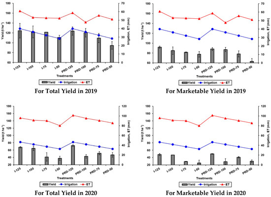 To more clearly demonstrate the water-yield relationships for cabbage in the study, visual representations of total and marketable yield, irrigation water, and evapotranspiration (ET) values are presented in Figure 3. The finding that evapotranspiration (ET) values were higher than the amount of irrigation water applied throughout the study provides compelling evidence that the water was used in an optimal manner, with no losses such as deep infiltration into the soil. The irrigation management was appropriate and effective. On the other hand, it was found that the reduction in the amount of irrigation water also led to a reduction in yield (Figure 3).