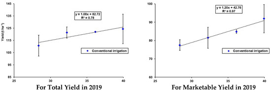 Correlations between irrigation water (mm) and cabbage yield (t ha−1) in conventional irrigation.