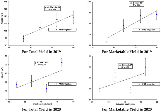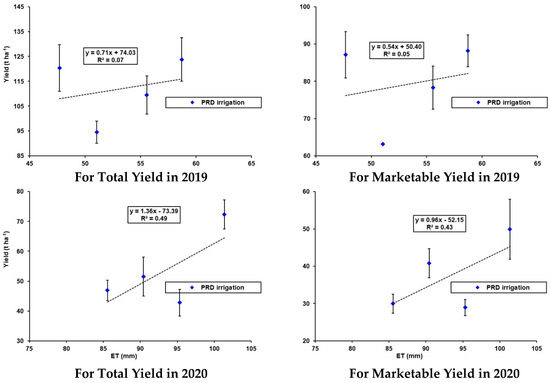 As with Figure 4, the correlation between the PRD technology (PRD-125, PRD-100, PRD-75, and PRD-50) and yield can be observed in Figure 5. It can be generally stated that the observed increase in yield values (Table 4) is attributable to the increase in irrigation water. Furthermore, this resulted in an increase in the IWUE values (Table 5, Figure 3). While not identical to Figure 4 and Figure 5, it is evident that the relationship between evapotranspiration (ET, mm) and yield (t ha−1) is influenced by the quantity of irrigation water applied (Figure 6 and Figure 7).