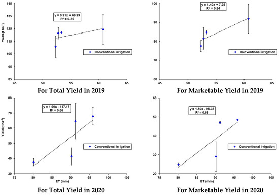 Correlations between evapotranspiration (ET, mm) and cabbage yield (t ha−1) in conventional irrigation.