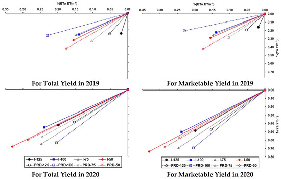 For total yield, the highest IWUE value (390.13 kg m−3) was calculated for I-50 in the first year and the lowest (309.88 kg m−3) was determined for PRD-125 (Table 5). The highest WUE value (155.89 kg m−3) was obtained for PRD-125 and the lowest (102.68 kg m−3) for PRD-100 in the second year. For the marketable yield, the highest IWUE value (273.20 kg m−3) was calculated for I-50 in the first year and the lowest (220.81 kg m−3) for PRD-125 (Table 5). The highest IWUE value (112.62 kg m−3) was recorded for I-100 and the lowest (69.43 kg m−3) for PRD-100 in the second year.