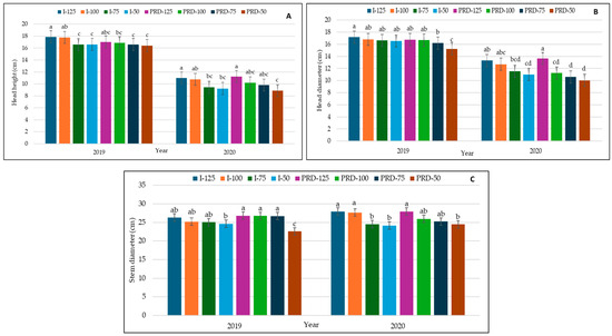 Effects of different irrigation levels on head height (A), head diameter (B), and stem diameter (C) of cabbage plants in the first and second years of the study. (Columns with different letters indicate the significance at p < 0.05 levels).