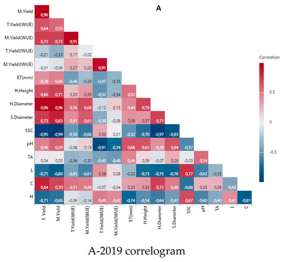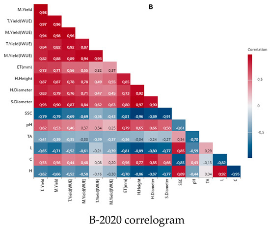 Upon evaluation of the significance of the correlation for the second year in terms of the parameters studied, it was observed that there were mutually strong positive relationships between marketable yield, WUE, and IWUE for total and marketable yield. ET appeared to have a positive relationship with total and marketable yield. It would appear that head height had a positive relationship with total and marketable yield, as well as with their WUE-IWUE and ET. As shown in Figure 10, head diameter, stem diameter, and pH had some positive significant relationships. SSC had negative significant relationships with some other parameters. While the significant relationships of L* color parameter were negative, its relationship with SSC was a strong positive relationship. There were also positive and negative relationships for C* and h° color parameters.