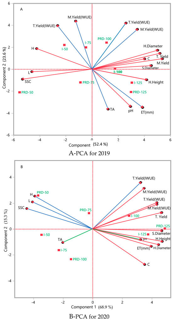 Principal component analyses of the criteria examining the effects of different irrigation practices for 2019 (A) and 2020 (B).