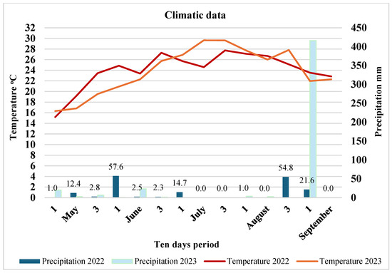 The Mediterranean climate of the research region is well known for its warm summers and moderate winters. For both experimental years, the average air temperature during the germination period (May) varied between 15.2 and 19.2 °C. The 2023 growing season experienced higher temperatures than in 2022. In 2022, the maximum average temperature during the crop’s growing season was 27.7 °C, with a minimum of 15.2 °C. In contrast, the 2023 growing season recorded a maximum average air temperature of 29.7 °C and a minimum of approximately 16.3 °C (Figure 1).