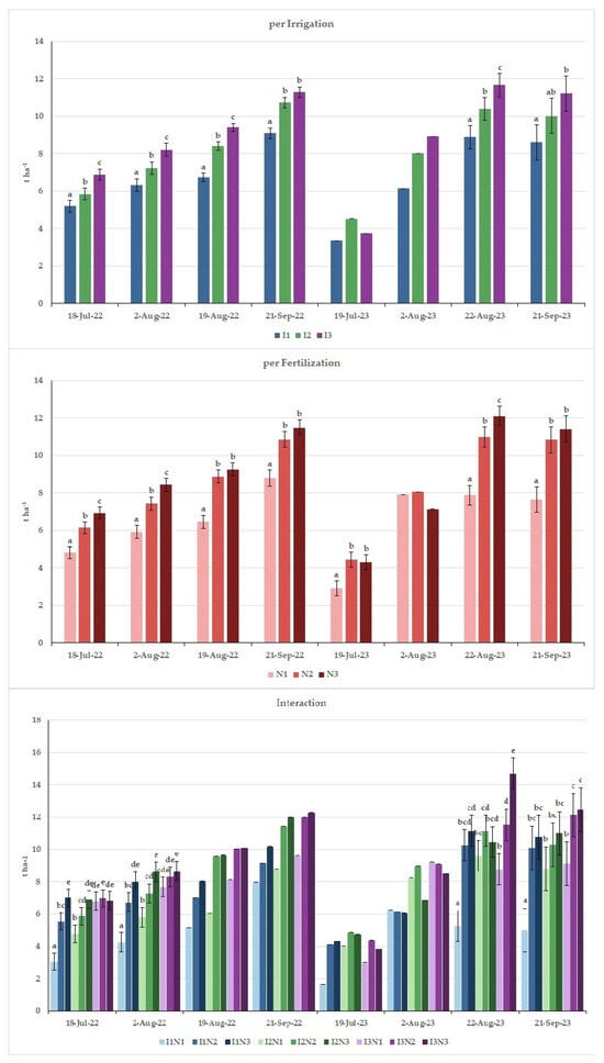 Although levels I2 and I3 of the dry biomass appeared to be the same in the case of the irrigation factor over the last two samplings, level I1 differed from both of these levels. At the final harvest, the I1 treatment’s dry biomass output was about 3 t ha−1 lower than the I3 treatment’s dry biomass yield of 11.23 t ha−1.