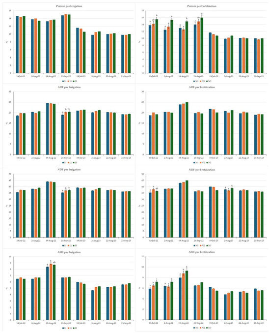 Figure 3 displays the findings of the 2023 initial sampling’s measurements of the quality characteristics. As can be shown, neither fertilization nor irrigation had any impact on quality features. The average protein, ADF, NDF, and ash levels during the initial sampling were 11.2%, 21.2%, 39.1%, and 5.9%, respectively.