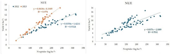 It is important to note that the yield–uptake relation’s slope represents the nitrogen use efficiency (NUE that has been obtained from the experiments conducted in both 2022 and 2023), which in our situation takes a significant value—roughly 51.5 kg kg−1 (Figure 4).