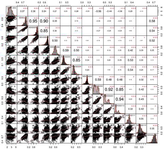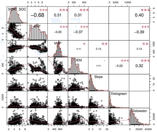 Correlation matrix of Pearson correlation coefficient (upper triangle) and scatter plot matrix among SOC_SQRT (N = 555) and nature factors at 300 m scale (lower triangle) in the study area. * indicates p < 0.05, ** p < 0.01, and *** p < 0.001.
