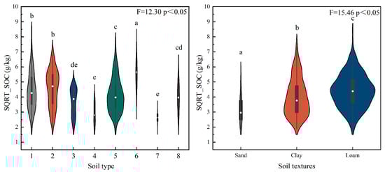 Box plot and one-way ANOVA of different nature factor with SQRT_SOC in study area (Soil type including: 1. Luvisols; 2. Semi-Luvisols; 3. Caliche Soils; 4. Skeletol primitive soils; 5. Dark Semi-hydromorphic soils 6. Hydromorphic soils; 7. Saline soils; 8. Anthrosols). If there is no same letter in the lower-case letters indicated for both factors, it means that they are significantly different from each other at the 0.05 level.