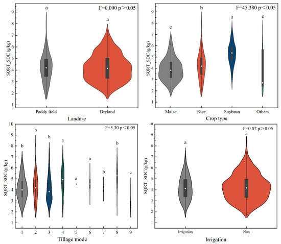 Box plot and one-way ANOVA of different cropping and management factors with SQRT_SOC in study area (tillage mode including: 1. Maize; 2. Rice; 3. Soybean; 4. Maize-Soybean; 5. Maize-Rice; 6. Maize-Rice-Soybean; 7. Rice-Soybean; 8. Fallow; 9. Other crop). If there is no same letter in the lower-case letters indicated for both factors, it means that they are significantly different from each other at the 0.05 level.