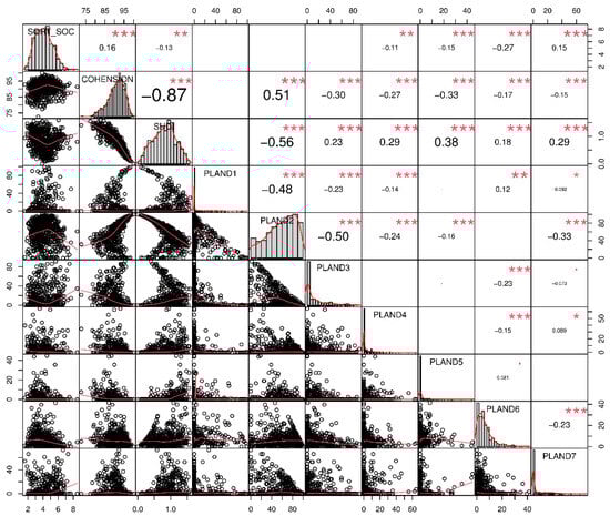 Correlation matrix of Pearson correlation coefficient (upper triangle) and scatter plot matrix among SOC_SQRT (N = 555) and the different landscape metric at 300 m scale (lower triangle) in the study area (PLAND1 to PLAND7, respectively, represent the proportional areas of paddy fields, dryland, forests, grasslands, water, urban and rural land, and unused land). * indicates p < 0.05, ** p < 0.01, and *** p < 0.001.