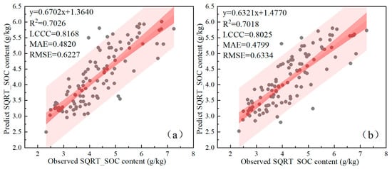 RF regression model and Cubist model were constructed using factors that demonstrated a statistically significant correlation at the p < 0.05 level, as analyzed through Pearson’s correlation coefficient and ANOVA in the previous section of this study. Upon assessing the statistical metrics, we discerned that RF model, characterized by a higher mean value of R2 and LCCC values alongside a lower RMSE, exhibited superior prowess in estimating observed SOC content compared to the Cubist model (Figure 7). Therefore, the RF model was deemed as the most suitable for the SOC content spatial distribution prediction.