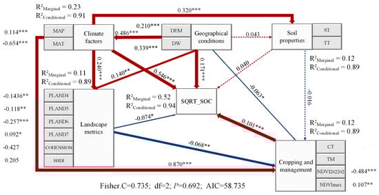 In order to further dissect the collective influence of various environmental variables, both individually and collectively, on SOC, as well as the driving relationship among these, the stepwise regression model outcomes guided the selection of latent variables. These encompass, climate factors, geographic factors, soil attributes, planting and management factors, and landscape pattern indices. Specifically, MAP and MAT serve as the observational variables for climate factors, whereas DEM and the distance to the water bodies represent the geographic factors’ observable variables. Soil type and texture are utilized as observable indicators of soil attributes. The latent variables within planting and management factors encompass crop type, tillage mode, NDVI202202 and NDVImax. For landscape pattern indices, PLAND4, PLAND5, PLAND6, PLAND7, and LSI_C are the observed variables. Based on these variables, a SEM model of SOC’s primary governing factors was formulate, incorporating random effects (Figure 9).