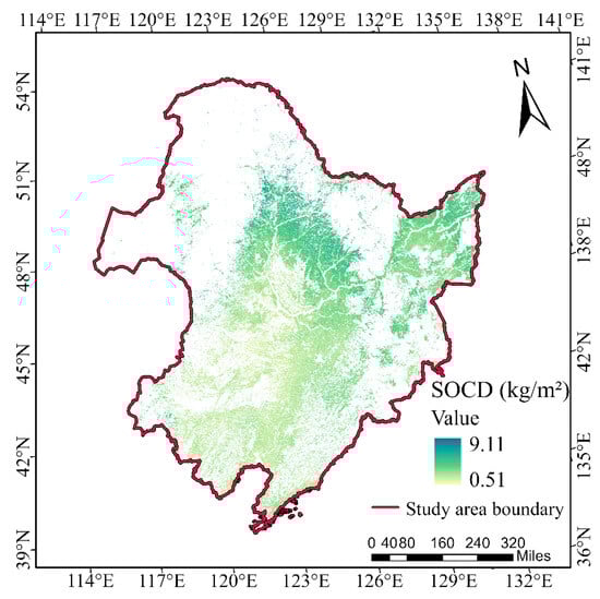 The SOCD of 0–15 cm of cropland in the Northeast black soil zone ranged from 0.51 to 9.11 kg/m2 with an average value of 3.30 kg/m2 (Figure 11). Accordingly, the current SOC storage capacity within this depth range in the region was estimated to be 1226.64 Tg. The SOCD was derived from SOC content according to the formula of Schwager and Mikhailova (2002), which comprehensively took into account the soil thickness, soil bulk weight and gravel content [34]. The overall spatial distribution maps of SOC content and SOCD exhibited remarkable similarity, indicating a negligible disparity in their overall patterns. This congruency extends to the observation that regions with abundant SOC content also display elevated SOCD values. Specifically, lower SOCD levels were recorded in the southern Songnen Plain and Liaohe Plain, while higher SOCD values were prevalent across Heilongjiang Province and the eastern segment of Jilin Province, mirroring the spatial distribution of SOC content.