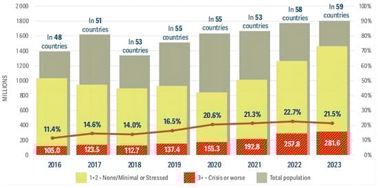 Numbers of people and share of the analyzed population in GRFC countries/territories facing high levels of acute food insecurity, 2016–2023.