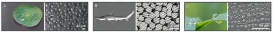 (A) Photograph of a lotus leaf and SEM image of its microstructures []. (B) Photograph of a shark and SEM image of shark skin microstructures []. (C) Photograph of droplets on rice leaves and SEM image of rice leaf microstructures [].