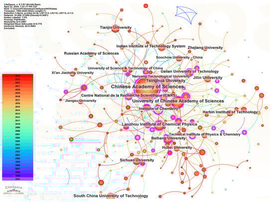 The co-occurrence network of research institutions and authors can be used to visualize the distribution of research power and the cooperation relationship between research groups in a certain field. The retrieved documents from the WOS core collection database were analyzed by the “Institution” function in CiteSpace, and the co-occurrence network of research institutes on super-wetting materials was obtained, as shown in Figure 4.