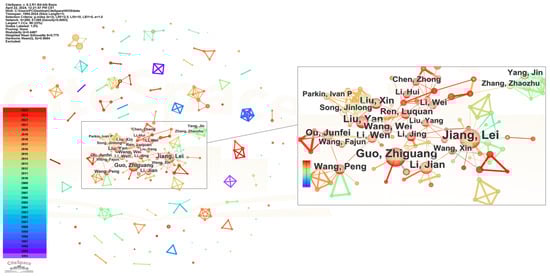 It can be seen from Table 1 that, among the top 10 research institutions, Chinese institutions accounted for 8 seats, and the number of publications of the Chinese Academy of Sciences is significantly higher than that of other institutions, indicating that China has shown strong research power in the research of super-wetting materials. The retrieved literature was analyzed by using the “Author” function in CiteSpace to obtain the co-occurrence network of authors, as shown in Figure 5.