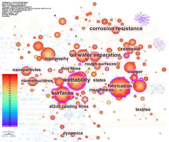 Keywords are a concise and distinctive representation of a research topic in a field, and the analysis of keywords in publications can be used to explore the main theme of the research []. When two keywords appear more frequently in the same literature, it means that these two topics are more closely related to each other. Therefore, a keyword co-occurrence network analysis can be used to determine the relationship between the topics and their disciplinary hierarchy in the discipline represented by the literature set. Figure 6 shows the keyword co-occurrence network of research on the topic of super-wetting materials. The node size in the network represents the keyword frequency; the greater the frequency, the larger the node, and the closer the relationship between research topics. The line color corresponds to the year on the right side of the graph; the brighter the color, the more recent the year, which is used to mark which major keywords are available in each year.