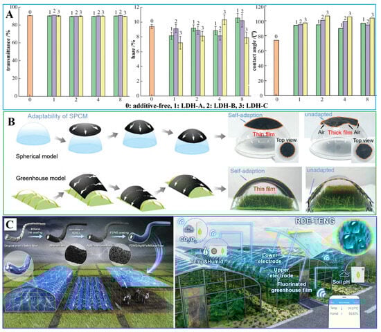 To meet the diverse demands of different climates, crops, and environmental conditions, the functionalization and modification of agricultural films have become crucial. For example, Mi et al. [,] developed superhydrophobic, dust-resistant composite films that are also durable, transparent, and thermally stable, as shown in Figure 7A. These films are designed to optimize light transmission, insulation, and mechanical strength, providing a robust experimental foundation for the development of high-performance, cost-effective agricultural films. The development of such films demonstrates significant innovation in material science, potentially leading to longer-lasting and more efficient agricultural practices. However, the production processes may be complex and costly, which could limit accessibility for small-scale farmers. Zhang et al. [] extended the lifespan of agricultural paper covers by creating superhydrophobic surfaces, thereby enhancing their resistance to water and extending their usability in the field. This advancement offers a practical solution to the common issue of the premature degradation of agricultural covers. Nonetheless, the environmental impact of increased plastic use in these treatments raises concerns, as non-biodegradable materials could contribute to pollution. Sui et al. [] prepared anti-fog films with an excellent performance by using anti-fog droplet agents (Span 20 and Tween 20) and co-modified nano-TiO2 based on the research foundation in the construction of carbon-based/polymer composite films and their energy management. While anti-fog technology is beneficial for maintaining optimal light conditions in greenhouses, the long-term stability and ecological safety of the surfactants used must be thoroughly evaluated to prevent unintended consequences in agricultural ecosystems. Furthermore, leveraging research on carbon-based/polymer composite films and their role in energy management, Chen et al. [] introduced a simple, efficient, and scalable method to fabricate Janus films. By embedding hierarchical nanostructured wax soot partially into polydimethylsiloxane (PDMS) elastomers, they achieved films with a remarkable superhydrophobicity and photothermal properties, as illustrated in Figure 7B. In agricultural applications, these Janus films could be used for water management on crop leaves, reducing the water loss through evaporation and optimizing the water usage in irrigation systems. Additionally, their photothermal properties can help regulate the temperature on plant surfaces, protecting crops from extreme temperatures and enhancing their growth efficiency. These films have the potential to reduce water loss through evaporation and optimize irrigation. However, the durability of these coatings under extreme weather conditions and their performance in real-world agricultural settings require further investigation. In smart greenhouses, the integration of super-wetting materials into films plays a crucial role in energy management and environmental control. Ping et al. [,] innovatively modified greenhouse films to incorporate a superhydrophobic, electrostatically negative layer that powers a self-cleaning friction nano-generator (RDE-TENG) for harvesting raindrop energy, as shown in Figure 7C. This system not only provides a stable power source for monitoring devices, but it also enables intelligent environmental control, guiding agricultural production towards greater efficiency and sustainability. This innovative approach not only contributes to energy efficiency, but also enhances environmental control within greenhouses. However, the complexity of integrating such systems may pose challenges in terms of maintenance and initial investment costs, particularly for smaller farming operations.
