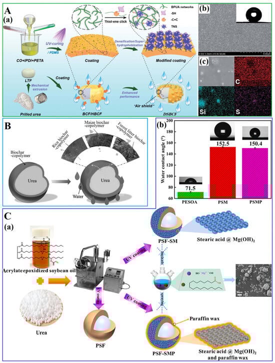 (A) (a) The design and working principle of the biopolymer-coated large tablet controlled-release fertilizer. (b) SEM images of DSBCF with the corresponding WCAs. (c) EDS maps corresponding to the SEM images and AFM images. (B) Hydrophobic bio-based polyurethane coating. (C) (a) Preparation process of PSF, PSF-SM, PSF-SMP. (b) Contact angle analysis of PSEOA, PSM, and PSMP.